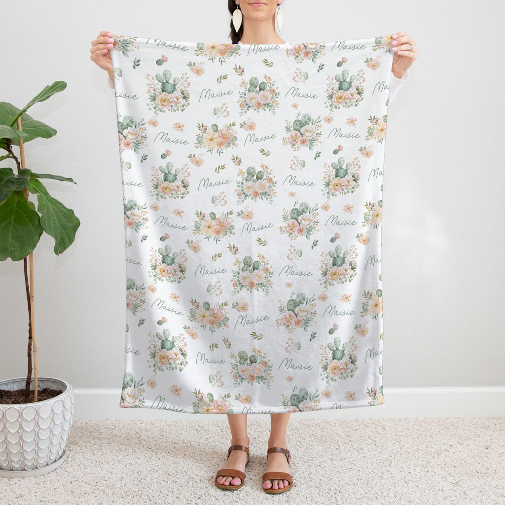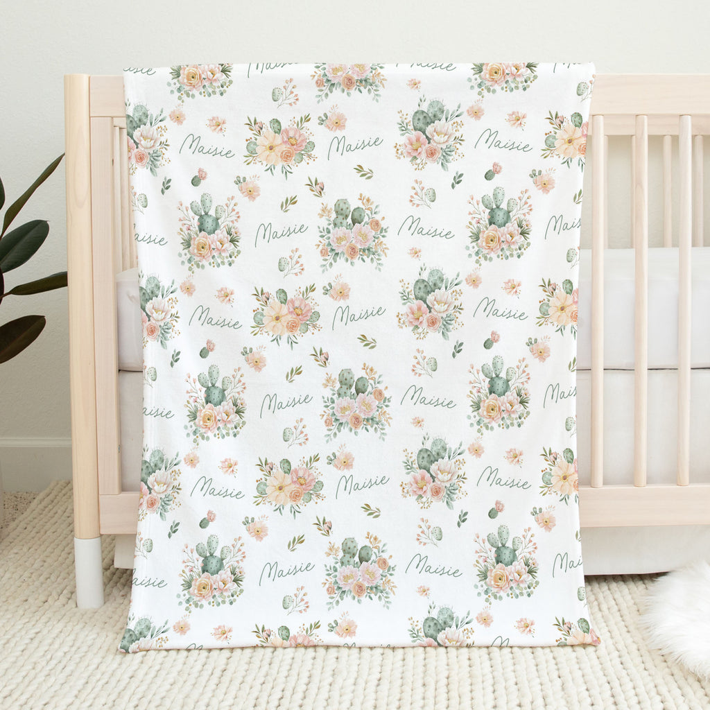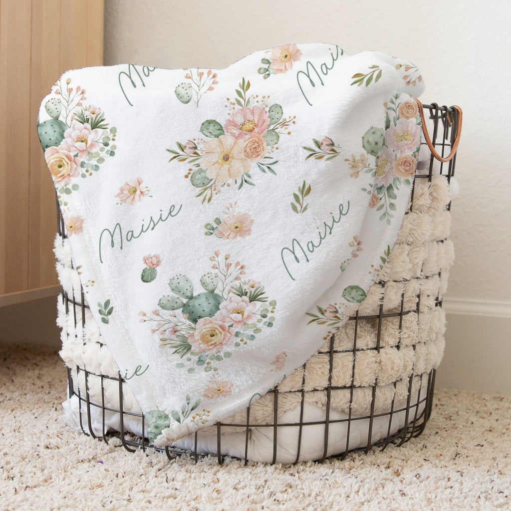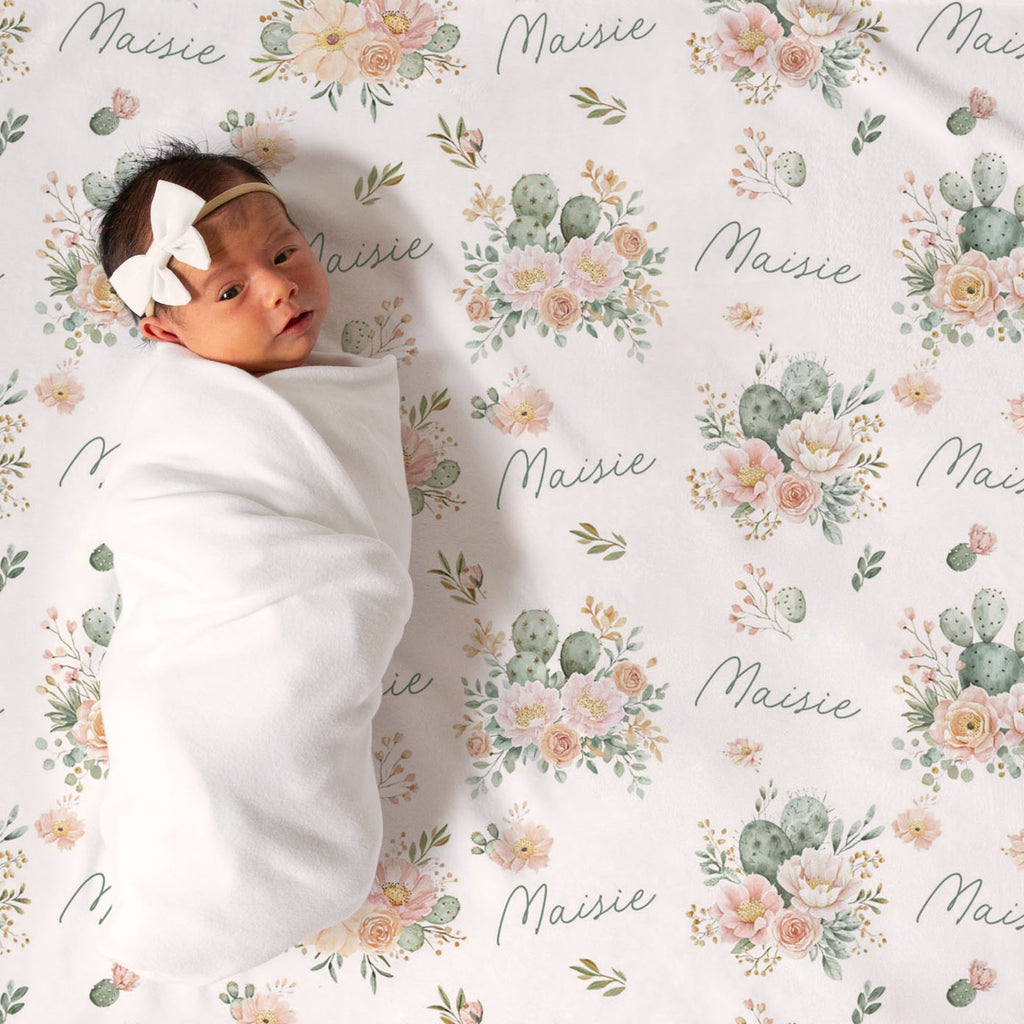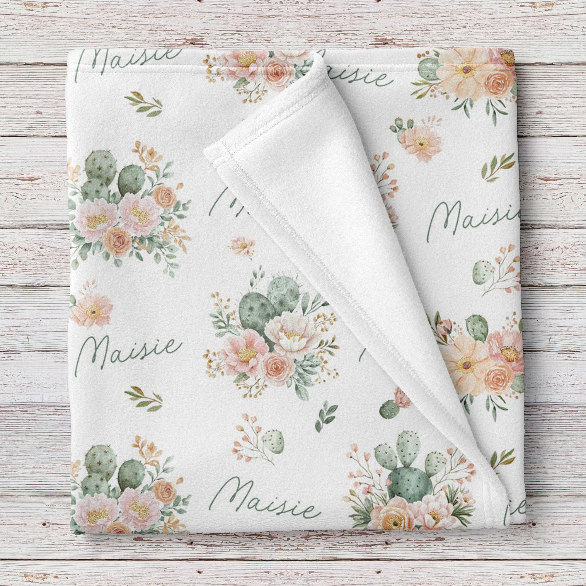 Made from a super soft fleece or minky material in a receiving blanket size of 30” x 40", this blanket is sure to become a favorite. It's perfect to wrap baby in, use in the stroller or as a one of a kind photo backdrop and makes a very popular baby shower or new baby gift.