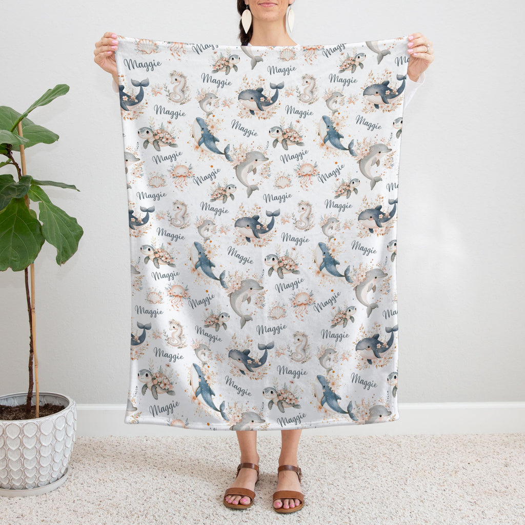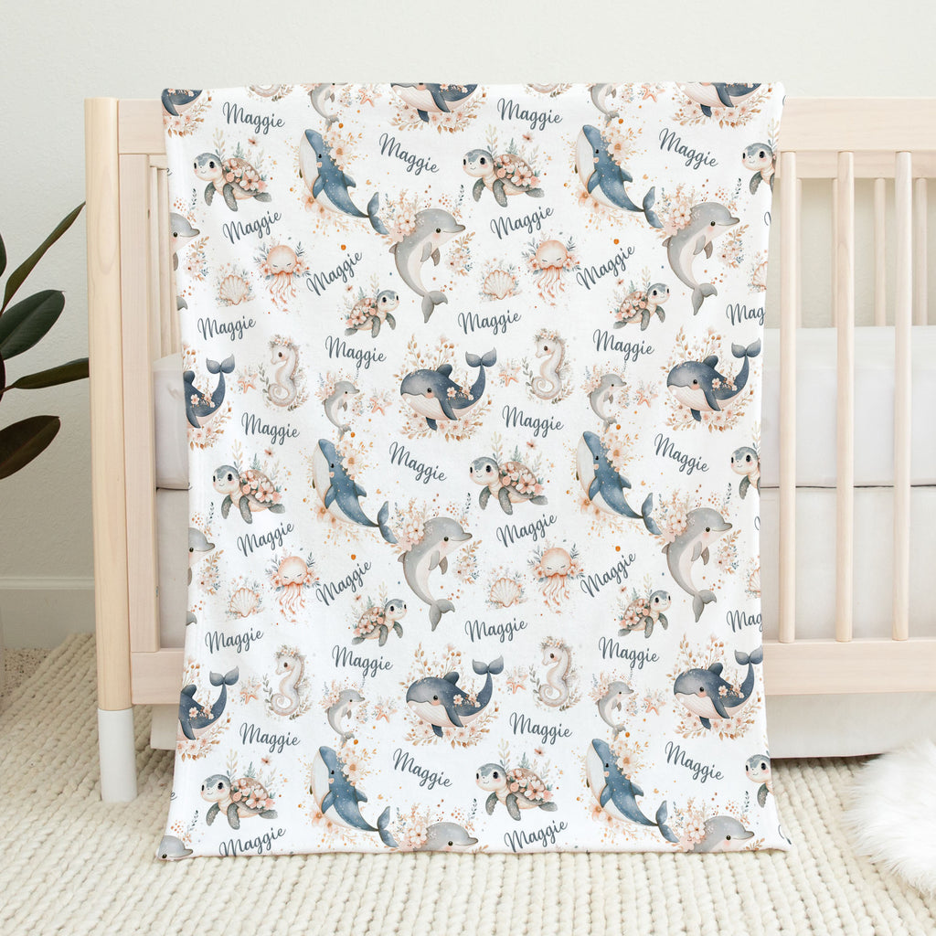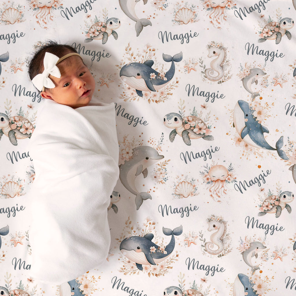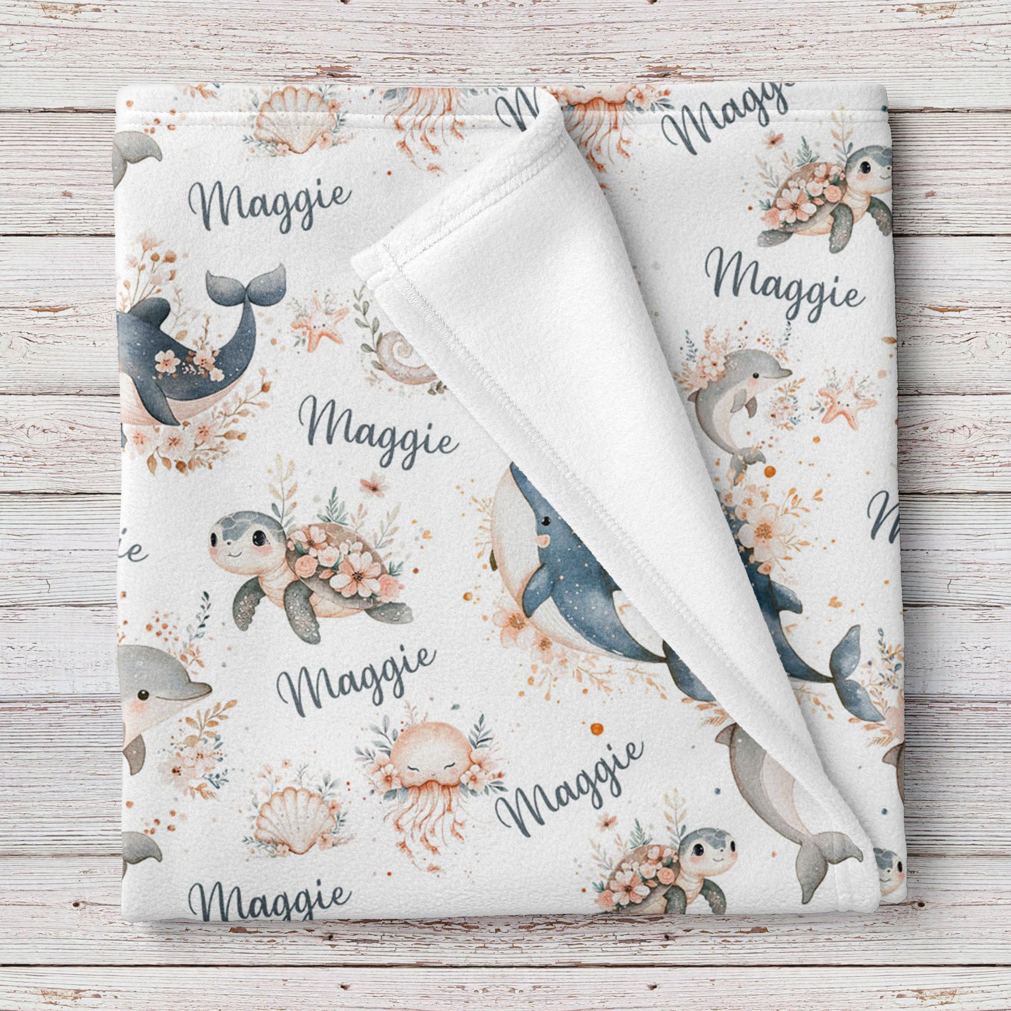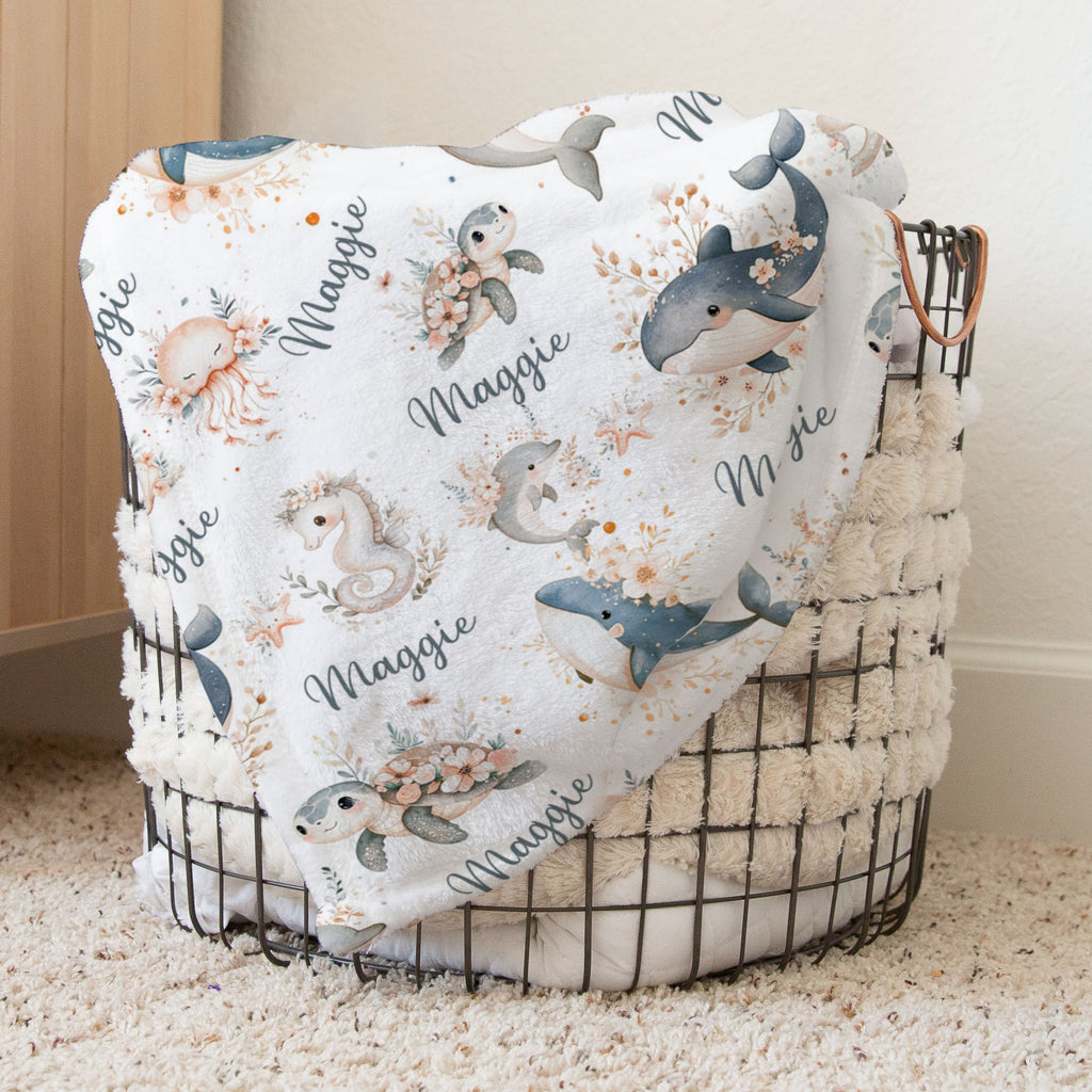 Made from a super soft fleece or minky material in a receiving blanket size of 30” x 40", this blanket is sure to become a favorite. It's perfect to wrap baby in, use in the stroller or as a one of a kind photo backdrop and makes a very popular baby shower or new baby gift.