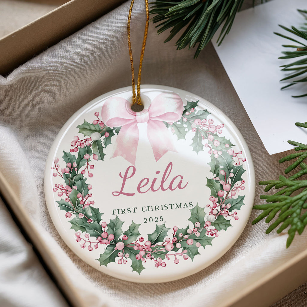 Baby's First Christmas Ornament, Classic Wreath Pink