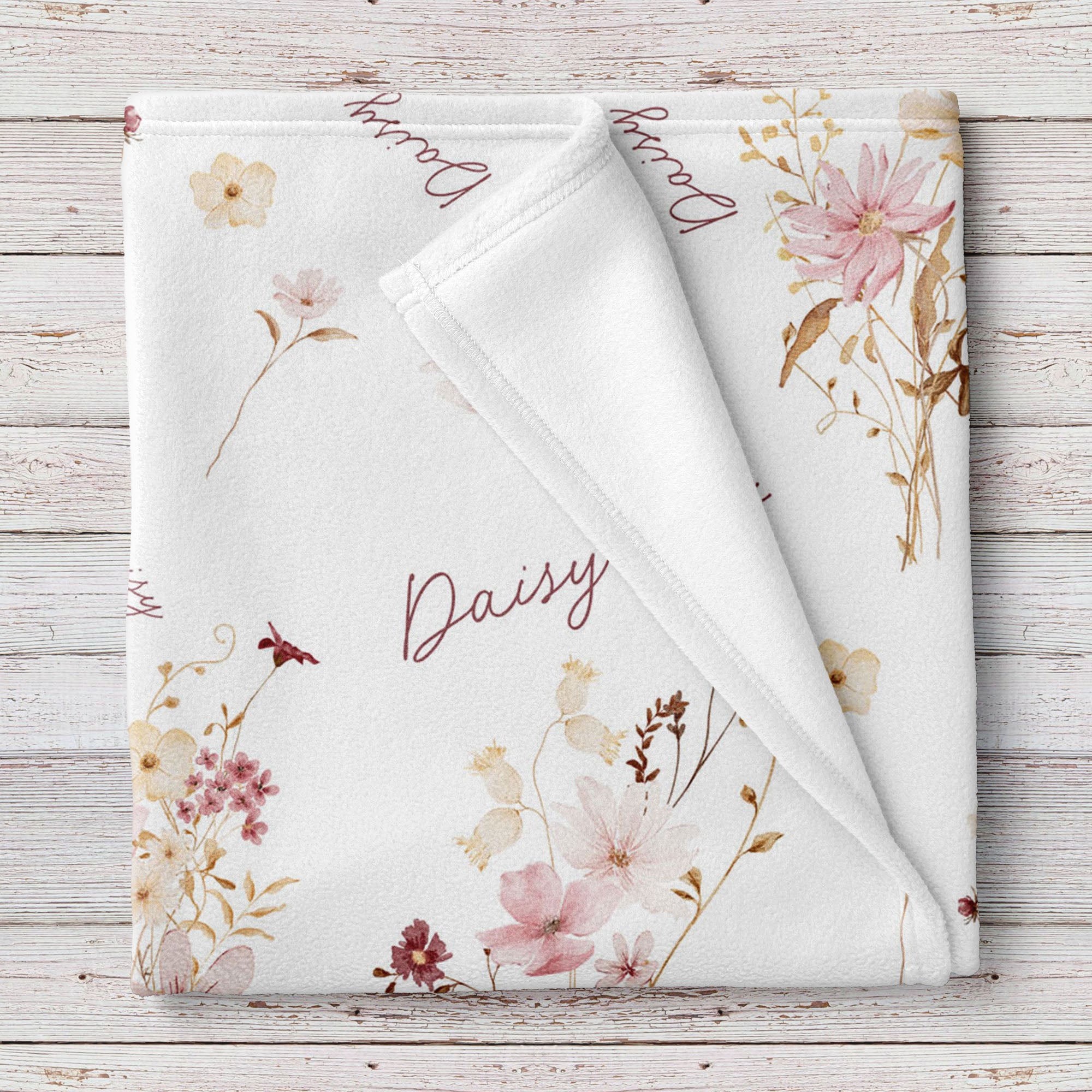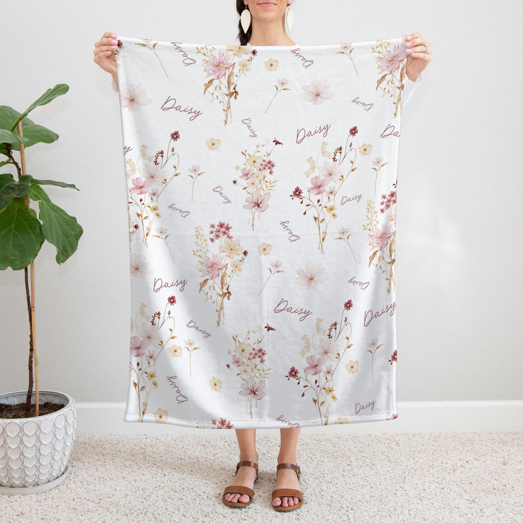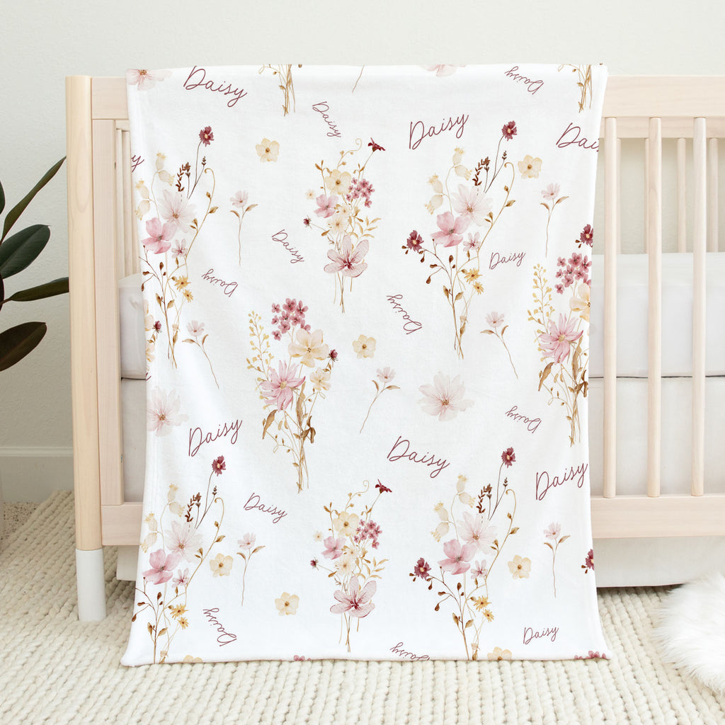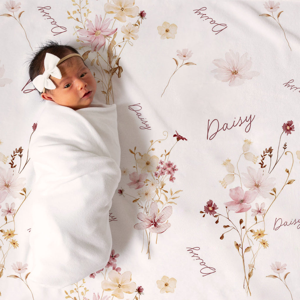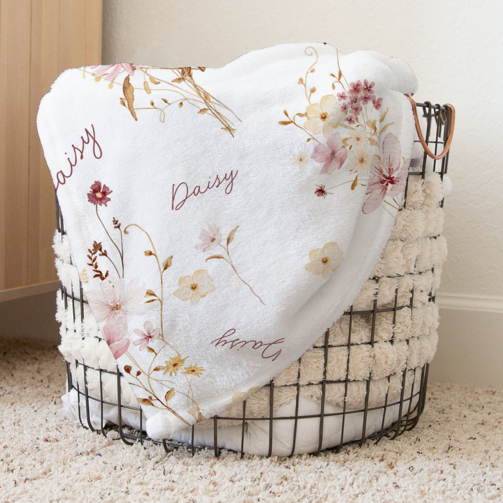 Made from a super soft fleece or minky material in a receiving blanket size of 30” x 40", this blanket is sure to become a favorite. It's perfect to wrap baby in, use in the stroller or as a one of a kind photo backdrop and makes a very popular baby shower or new baby gift.